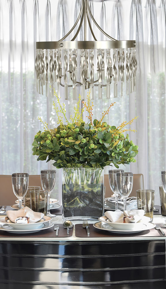 Strands of metal twists and crystals create a shimmering and reflective pattern of light. All Framburg lighting products are handcrafted in the USA.