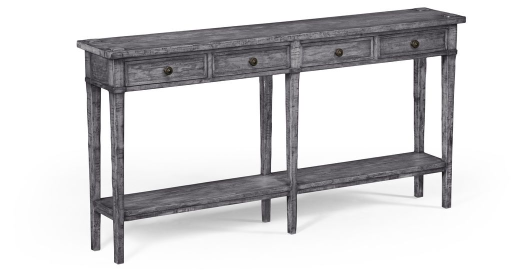 Rectangular anitque dark grey narrow console with a rustic finish and panelled top showing exposed saw marks above four drawers set on an open base with under-tier.
