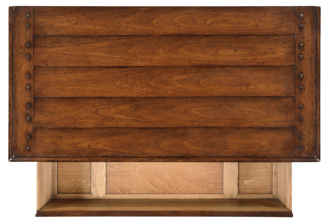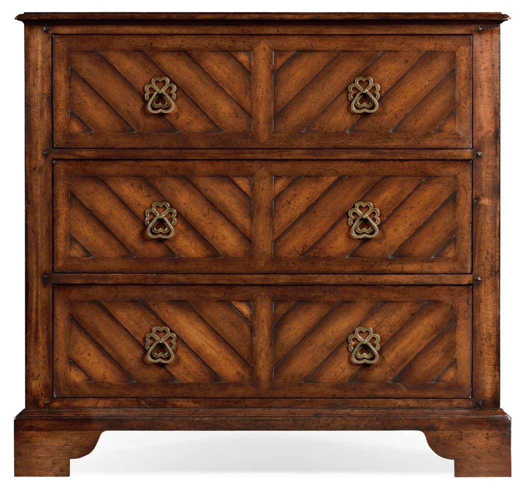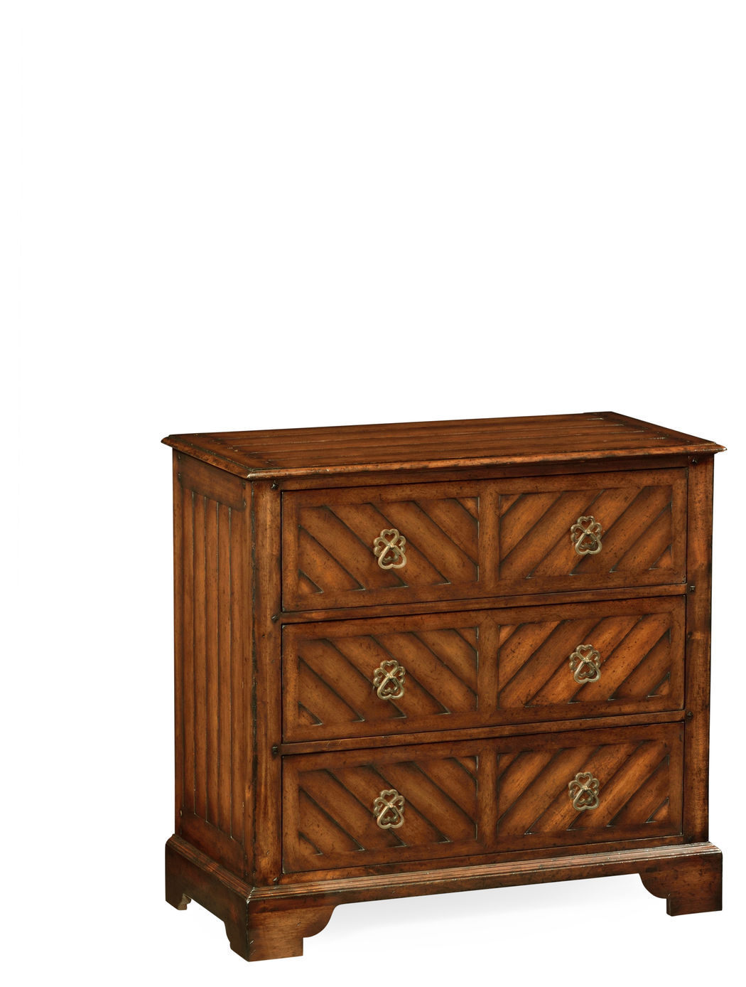 The Jonathan Charles 492041 Chest comes in Walnut Medium finish, is from the Special Order Collection and measures 35.98W x 17.99D x 34.06H inches. Walnut parquet rectangular three drawer chest with distressed country finish. Patinated brass cloverleaf handles and set on bracketed block feet.