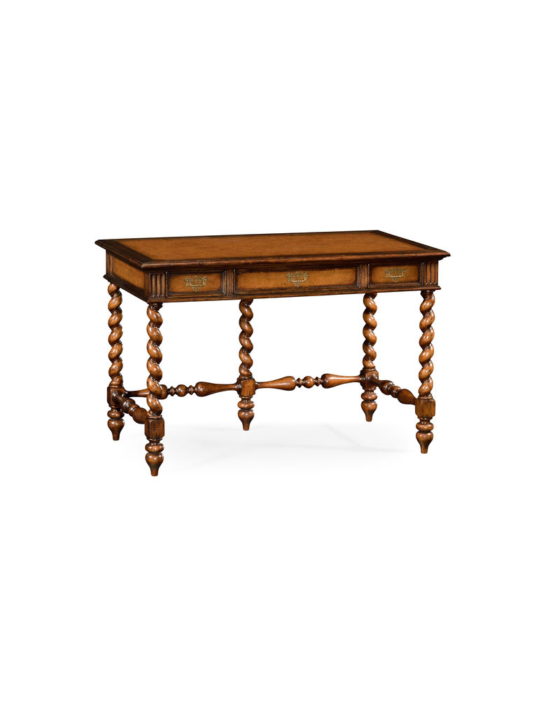 The Jonathan Charles 492079 Desk Table comes in Walnut Medium finish, is from the Country Farmhouse Collection and measures 47.24W x 26.18D x 30.87H inches. Small walnut and leather inset panelled desk with five heavily twisted turned legs and three drawers with finely cast brass handles.
