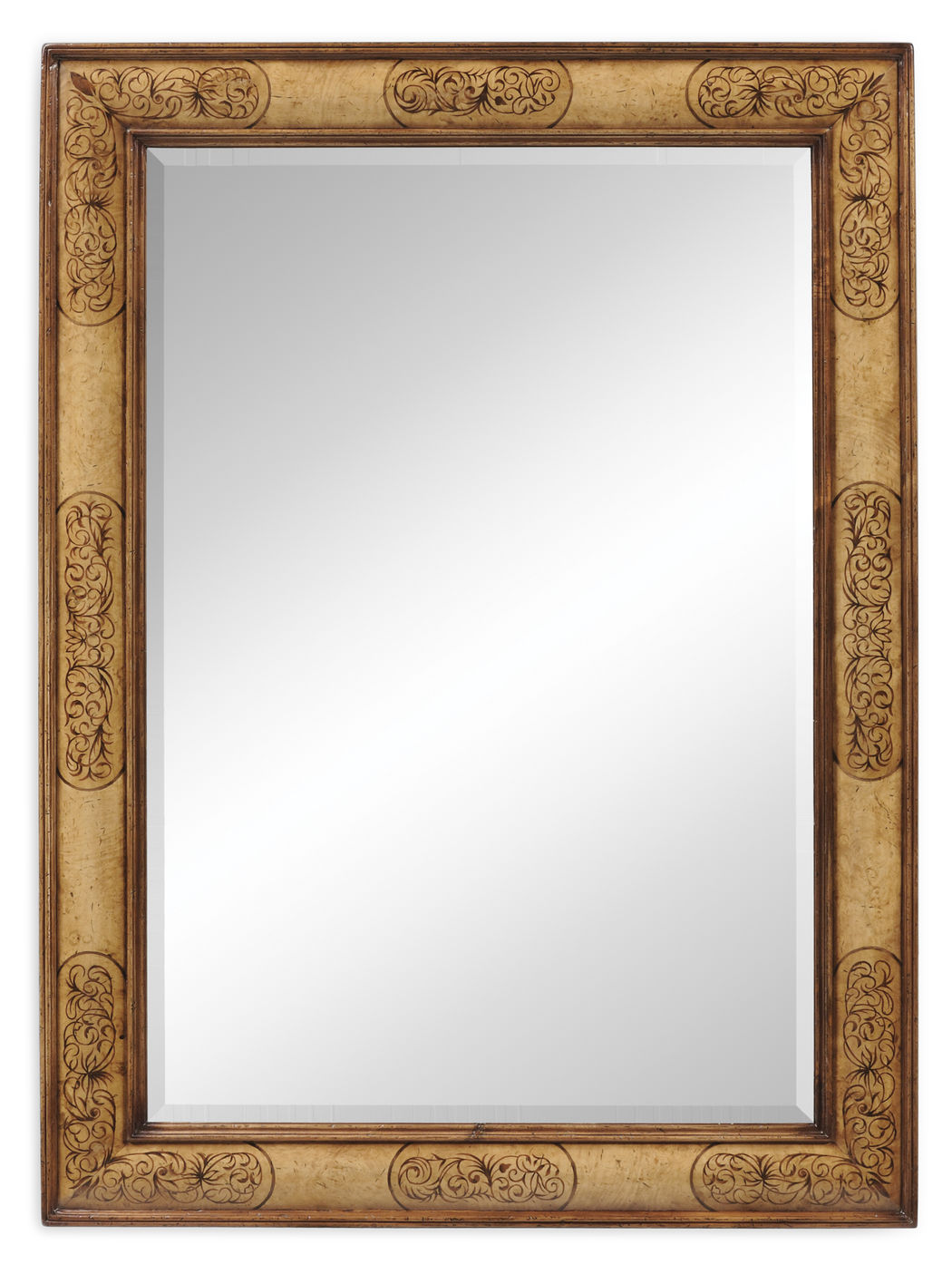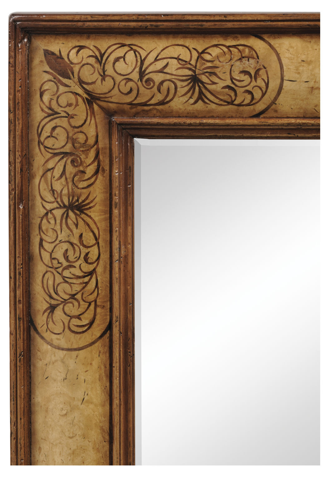 The Jonathan Charles 492486 Mirror comes in Walnut Light finish, is from the La Rochelle Collection and measures 37.52W x 1.18D x 50.98H inches. This item features a Plain Beveled Glass. Rectangular walnut framed mirror with cushion moulding of light burr veneers with contrasting fine marquetry inlays of scrolling arabesques. Plain mirror glass.