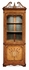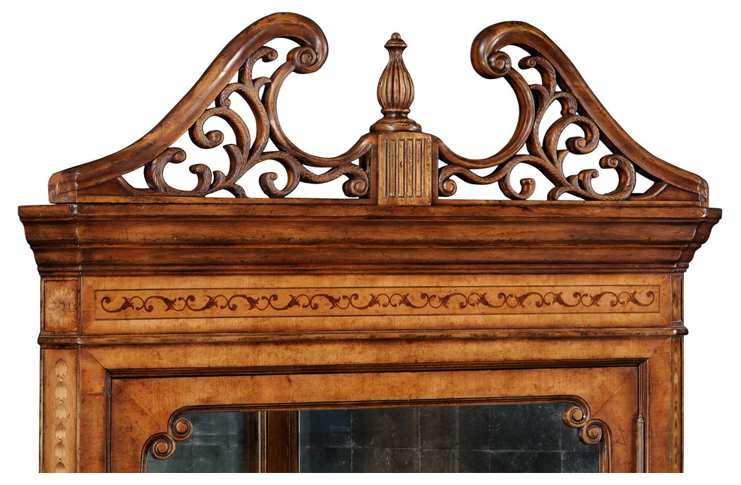 Classically styled satinwood veneered corner display cabinet with finely carved double scrolled pediment, eglomise glass interior and adjustable glass shelves. Marquetry inlay detail throughout, with a cartouche on the single door below surrounded by stylised cornucopia ornaments. Range sensitive lighting with touch controlled dimmer. (Old salescode: 492817)