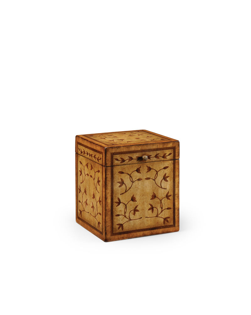 The Jonathan Charles 493004 Accessory Box comes in Walnut Light finish, is from the Country Farmhouse Collection and measures 9.45W x 9.45D x 11.02H inches. Elegant Sheraton style square hinged lidded walnut box with distressed finish, the top and sides with a contrasting marquetry design of stylized leaves and flowers. Based on a late eighteenth century original.