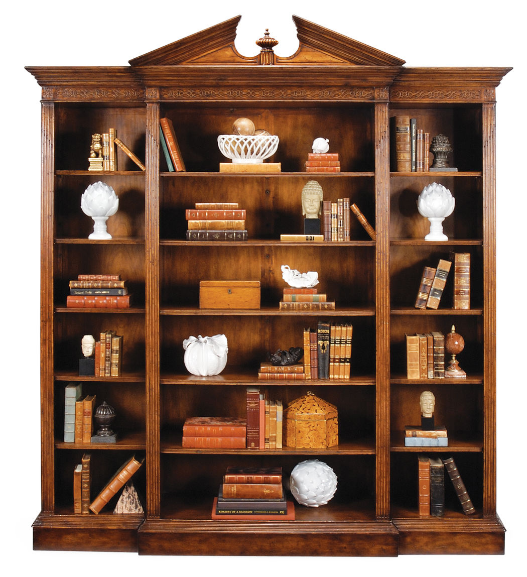 Triple Breakfront Walnut Open Bookcase with Pediment