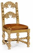 The Jonathan Charles 493161 Dining Chair comes in Tudor Oak Dark Brown finish, is from the Tudor Oak Collection and measures 21.26W x 22.76D x 41.1H inches. This item features a Seat Height 21 inches (53 Cm). Heavily carved dark oak side chair in the Elizabethan style with a distressed leather drop-in seat and bobbin turned legs and stretchers. After an original of c.1600.