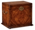 Square crotch walnut veneered hinged lidded box ideal for jewellery with an interior lined with compartments that lifts out to reveal storage beneath, and finely cast patinated brass catch and handles. The whole raised on a distressed walnut stepped base.