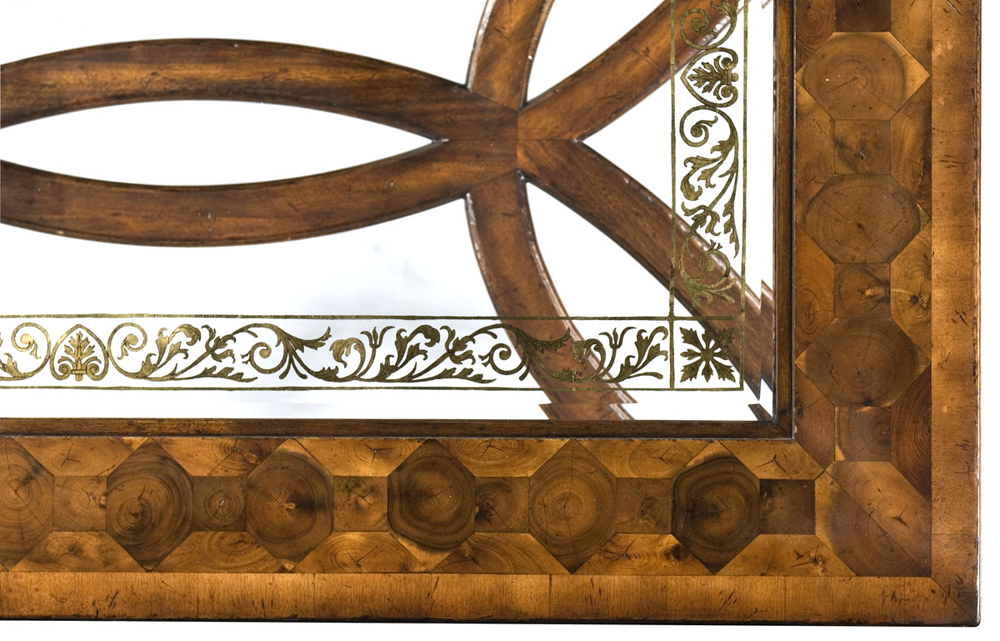 The Jonathan Charles 493447 Coffee Table comes in Walnut Medium finish, is from the Windsor Collection and measures 52.56W x 31.97D x 20H inches. Oyster veneer rectangular coffee table with hand painted Italian gold leaf eglomise decoration on the glass top set on barley twist legs above an openwork base.