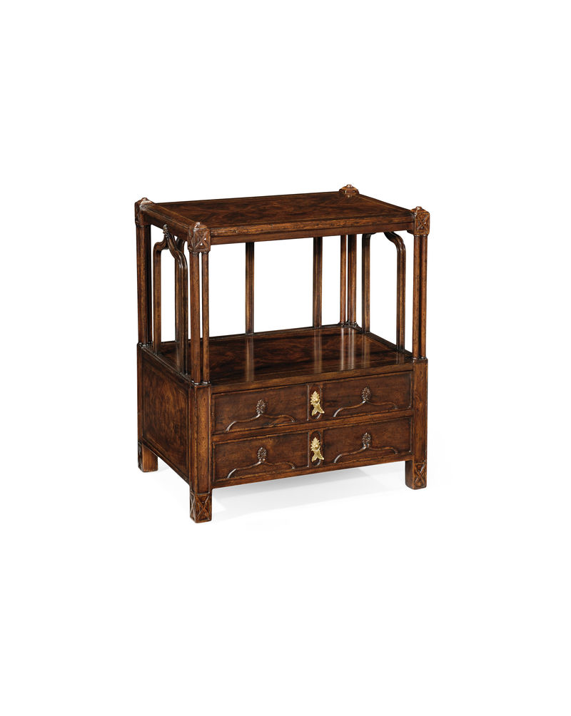The Jonathan Charles 493496 Occasional Table comes in American Crotch Walnut Dark finish, is from the Tribeca Collection and measures 24.02W x 17.01D x 28.46H inches. Dark American crotch walnut side table with drawer fronts hand carving.