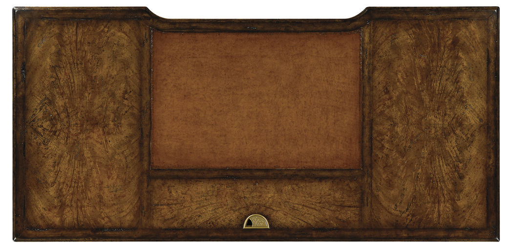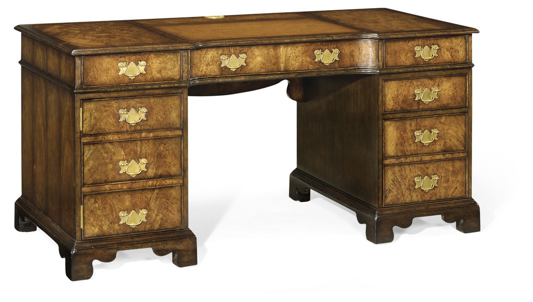 George I style writing desk made from rustic crotch walnut with an antique brown leather writing surface and cable management. The left faux drawer for computer/printer storage and the right for hanging files. Fine brass drop handles and backplates.