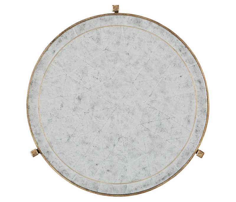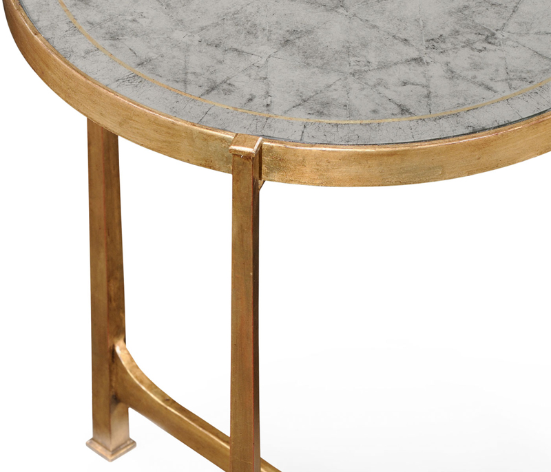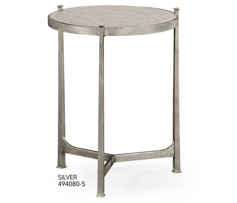 The Jonathan Charles 494080 Occasional Table comes in three Gilded Iron finishes, Gold, Silver and Bronze. It is from the Luxe Collection and measures 20.12W x 20.12D x 23.82H inches. Contemporary wrought iron circular lamp table with distressed gilded finish and hand painted gold borders to the eglomise glass top set on a Y-shaped stretcher arrangement, the legs rising up above the border of the table top.