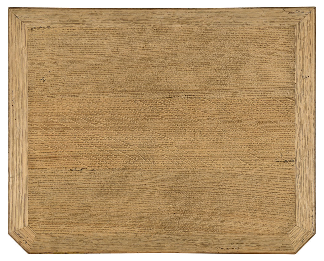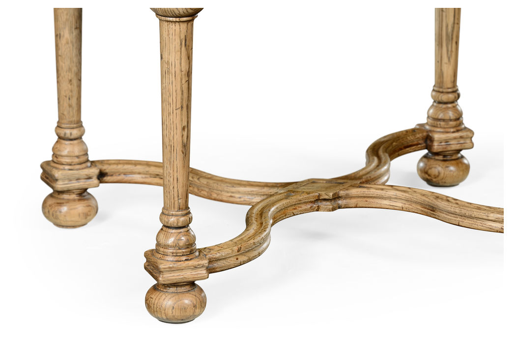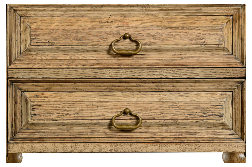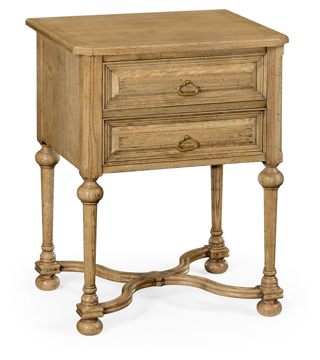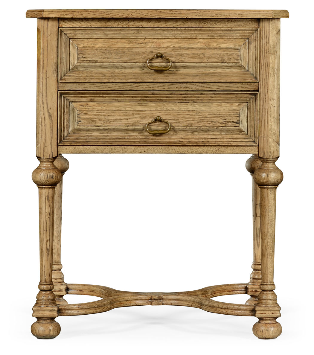 Natural oak substantial side table with stepped pyramidial panelled mouldings to the two drawer fronts and stylised brass drawer handles. Turned tapering baluster legs above a curved X-frame stretcher. The design based on a transitional piece of c.1600.