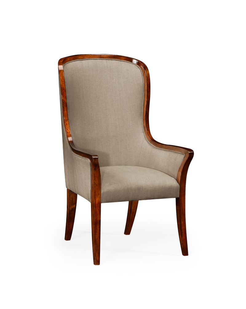 Elegant walnut dining armchair loosely based on a 19th century porter's chair with a high upholstered curved back and sweeping arms with further upholstered panels, sabre legs to front and back. The original of c.1880.