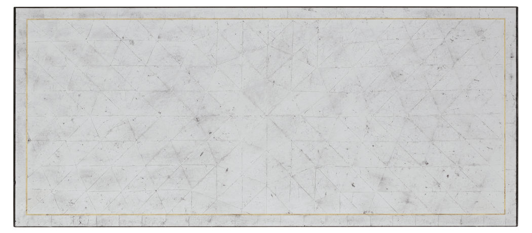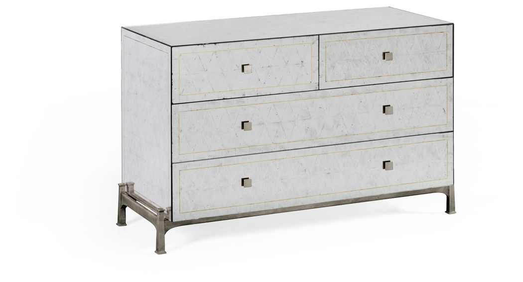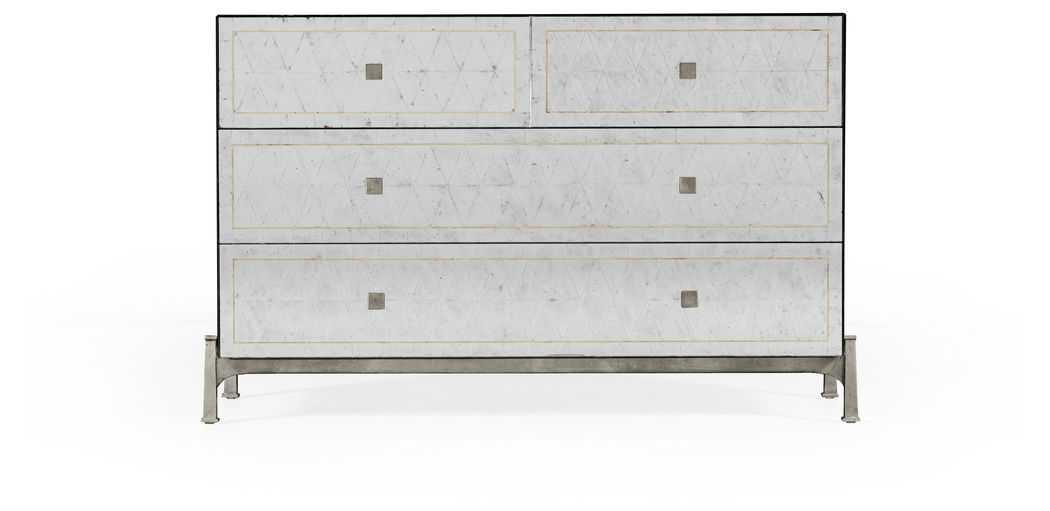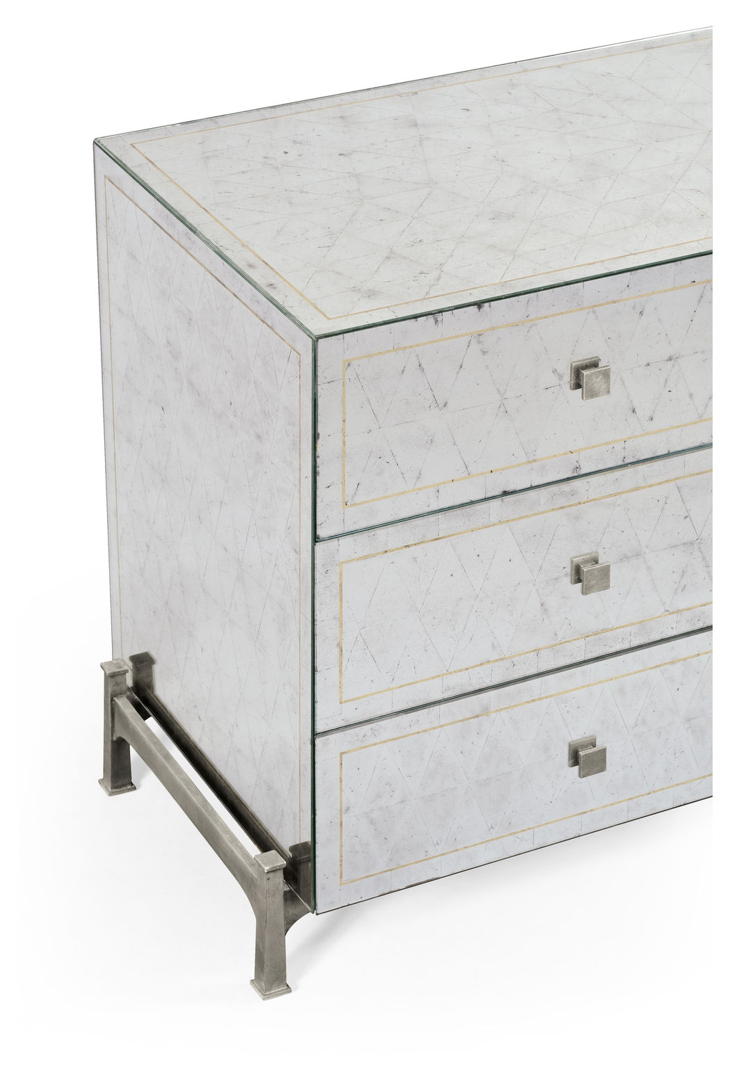 Available in Bronze, Gold & Silver. Contemporary chest of five drawers with handpainted silver borders to the all-over eglomise glass top made with silver leaf. Set on a shallow distressed gilded wrought iron base.