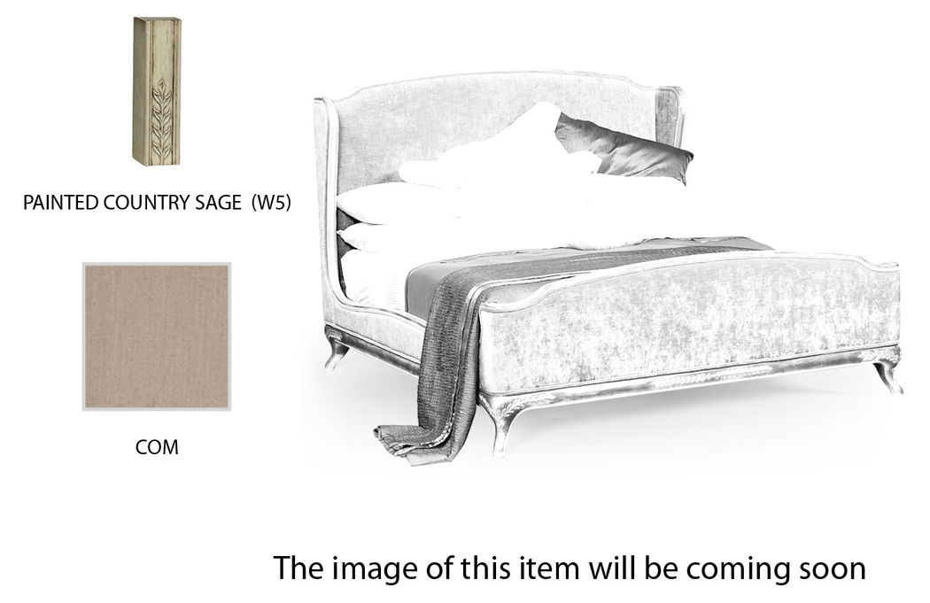 Louis XV French style upholstered in lining US queen bed, with high winged headboard and low footboard, the carved gilt frame set on cabriole legs and with carved classical leaf motifs. Fabric: COM (12.8 metres/14 yards fabric). Choice of 7 wood finishes: Antique gilded and silver, mahogany, walnut, painted country sage, painted grey weathered, limed tulip wood.