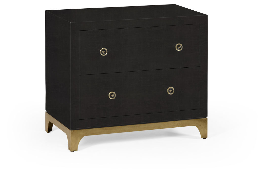 Chic lacquer low chest of two drawers designed by Alexander Julian inspired by his "Grey Flannel Blazer Suit" from 1976. The charcoal lacquer panels raised on a gilded base. Unique custom made Italian enamel pulls resembling buttons on a double-breasted blazer.