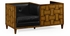 Transitional love seat inspired by European mid-20th century design, fully upholstered in supple black leather. The sides and back panels decorated with a woven parquetry inaly pattern in contrasting veneers.