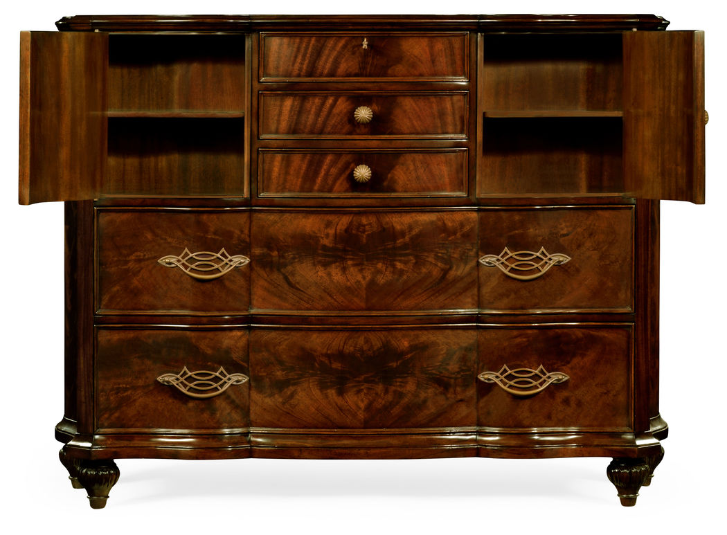 Large chest of drawers in antique mahogany with brass handles and two doors opening onto an interior which features a single shelf.