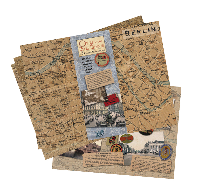 Set of 12 placemats depicting six European cities as they were in the early 1900s. Berlin, London, Madrid, Paris, Rome and Vienna.