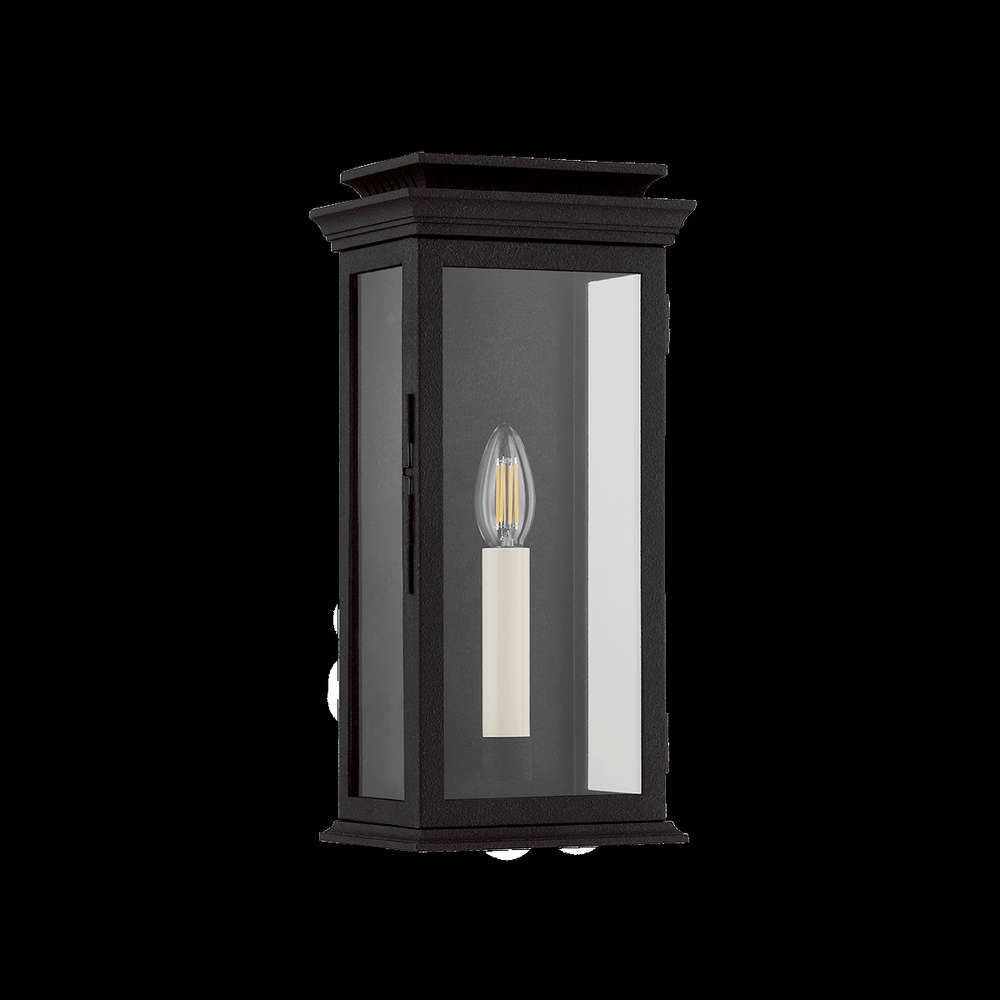 Drawing inspiration from a vintage lantern, Louie features a simple box shape with elevated details. Off-white candlesticks glow from within the frame, which is defined by three glass panels and a black backplate. The decorative chimney perched atop adds character to this transitional wall light. Louie is available in two sizes in a Forged Iron finish.