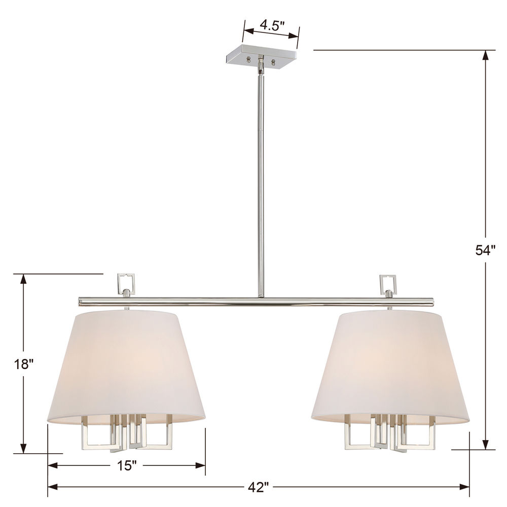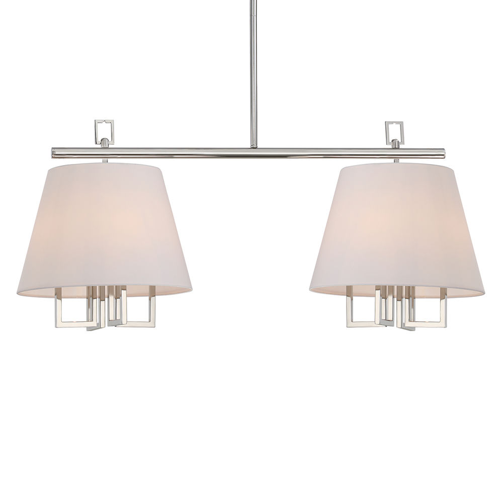 The signature Libby Langdon attention to detail is apparent in the Westwood collection. This light features an angular polished nickel frame topped with crisp white shades for an electric yet modern design. I truly believe design is in the details. An element I love with the Westwood collection is how the top loop mimics the same angles as the lower metal fretwork. It's a small attention to detail but a big part of the overall look because it artfully repeats the design theme and helps to balance the fixture, Libby Langdon Perfect for a dining area, living room or even entry way, this fabulous light will add the perfect accent to any space.