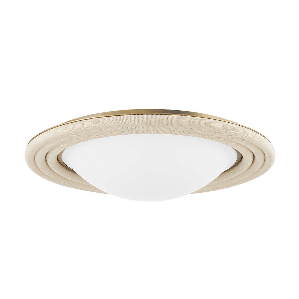 A series of white cotton rope rings wrap around an opal matte shade, creating a soothing rippling effect. The organic materials, straightforward silhouette and neutral tones blend well with many interiors. An LED lamp allows this flush mount to have a slim profile on the ceiling.