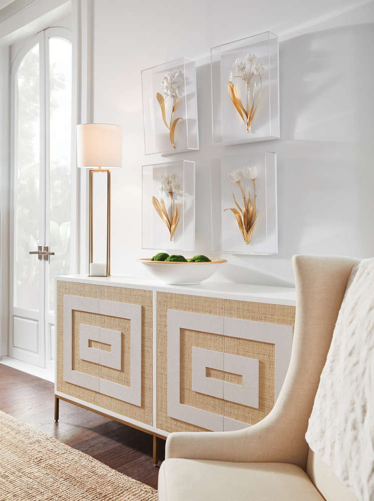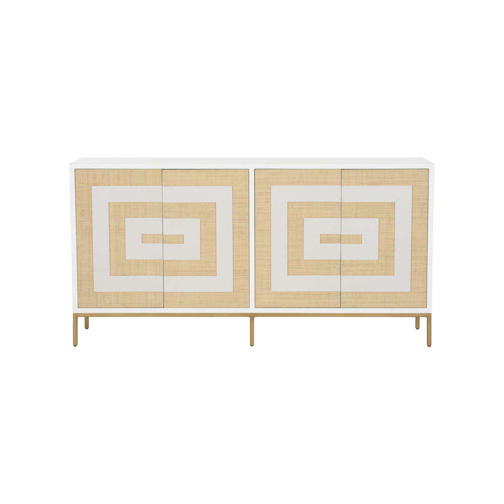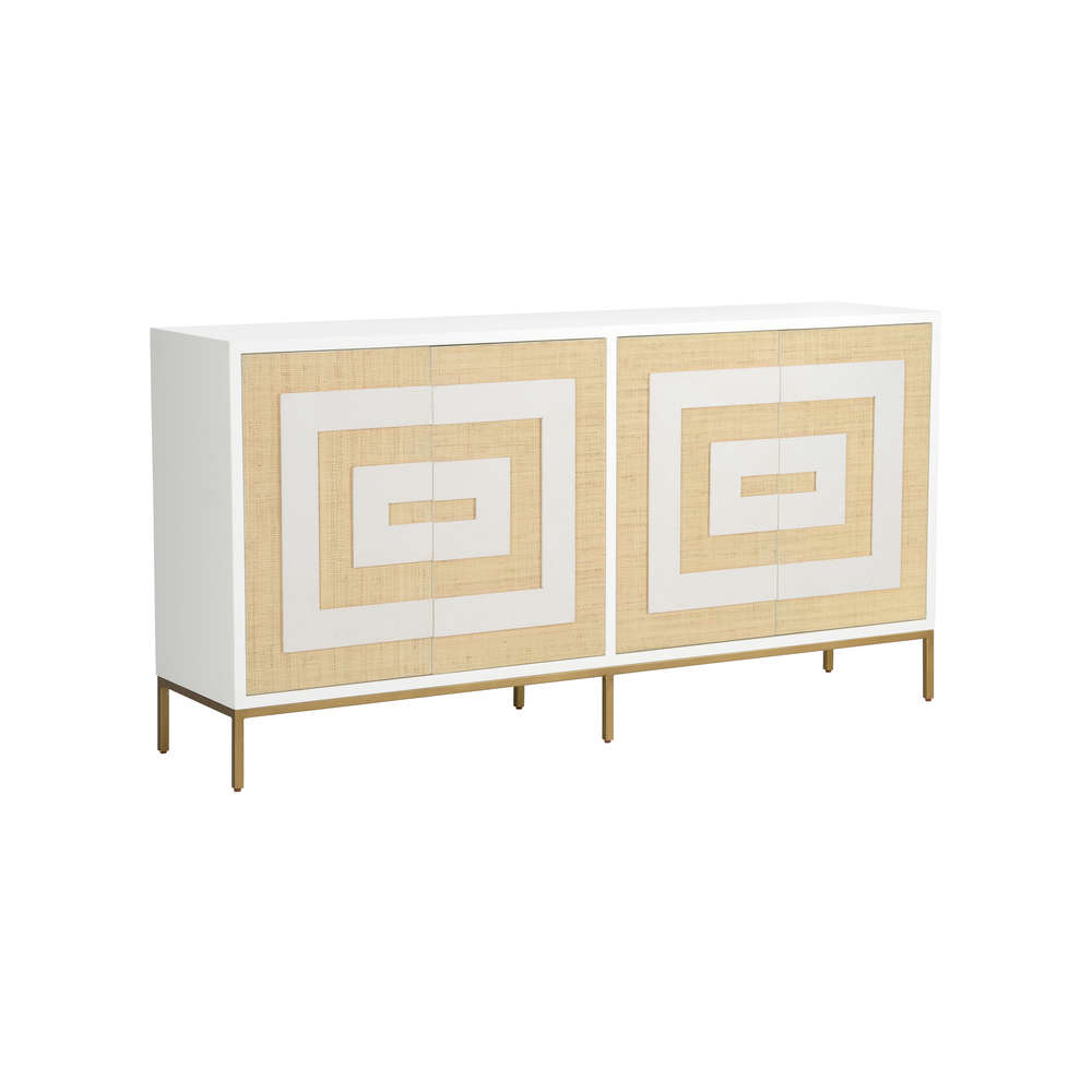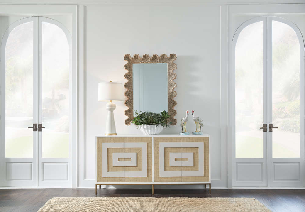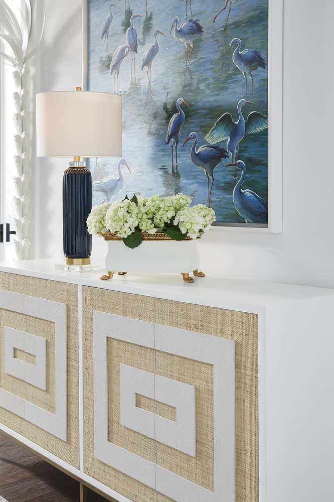 The Sloane Street CabinetŐs unique design in a mixture of a grasscloth weave and wood detail on the doors bring character and depth to the piece. Whether placed in a coastal retreat or a modern urban dwelling, its timeless design and painted in a crisp white finish effortlessly complement a variety of decor styles. The push open doors not only enhance the cabinets clean aesthetic appeal but also provide a sleek way to easily open and close of the doors. Designed by Bill Cain.