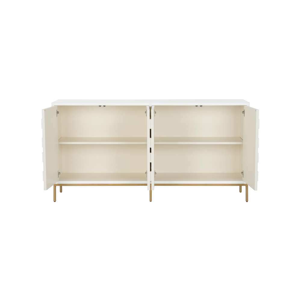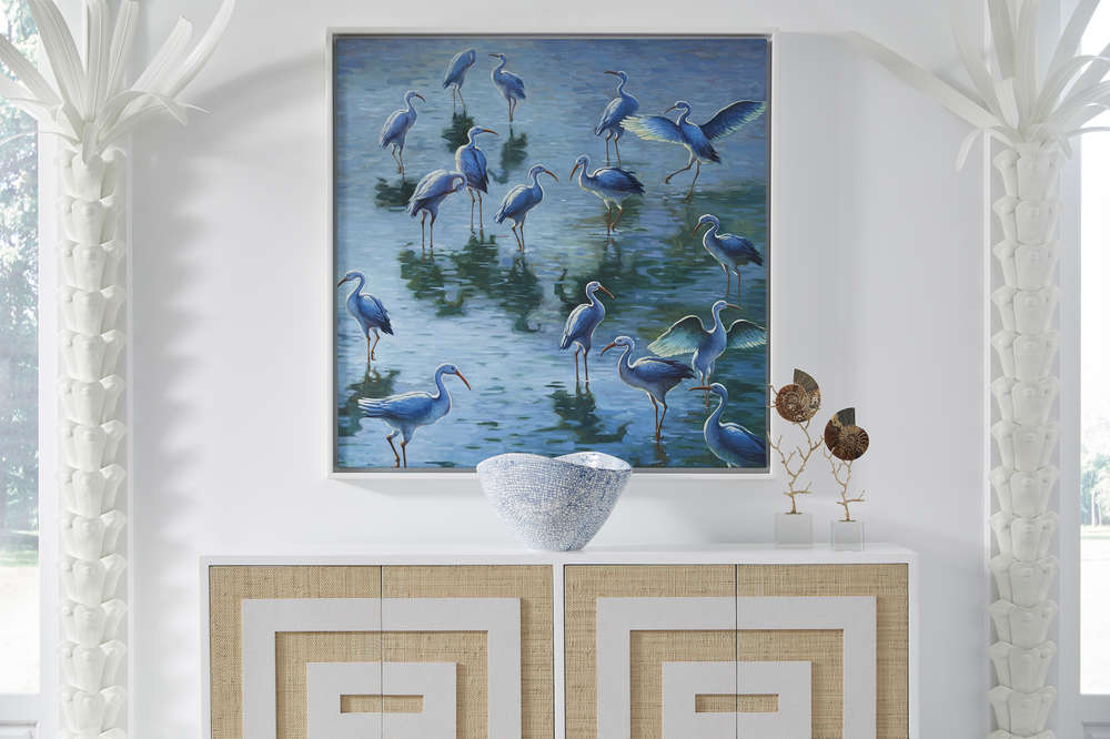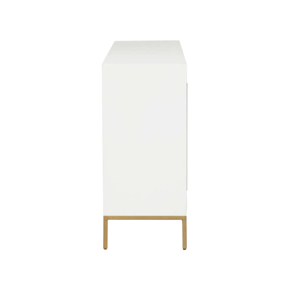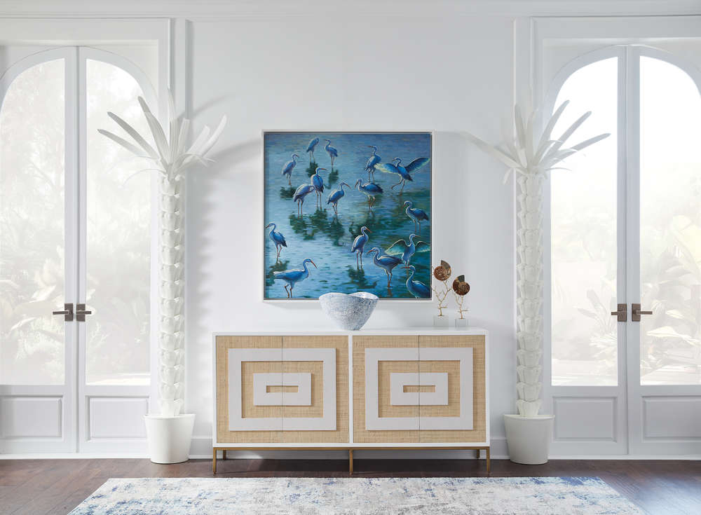 The Sloane Street CabinetŐs unique design in a mixture of a grasscloth weave and wood detail on the doors bring character and depth to the piece. Whether placed in a coastal retreat or a modern urban dwelling, its timeless design and painted in a crisp white finish effortlessly complement a variety of decor styles. The push open doors not only enhance the cabinets clean aesthetic appeal but also provide a sleek way to easily open and close of the doors. Designed by Bill Cain.