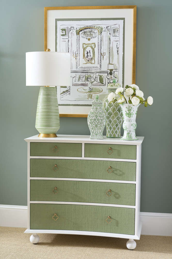 The Maxwell Chest is a stylish five-drawer piece featuring a wooden frame finished in crisp white, elevated by classic ball feet. The drawers are wrapped in green raffia, adding texture and a coastal charm, while antique brass hardware enhances its timeless elegance. Designed by Bill Cain.
