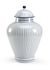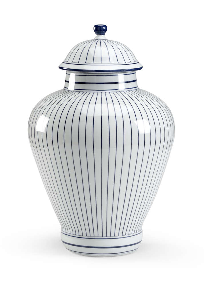 Add this classic blue and white glazed porcelain urn to your home. This 23" hand decorated accent features blue stripes and a removable lid. A great addition to create visual interest on tabletops or shelves in any decorative style. May be paired with our 14.5" castle urn.