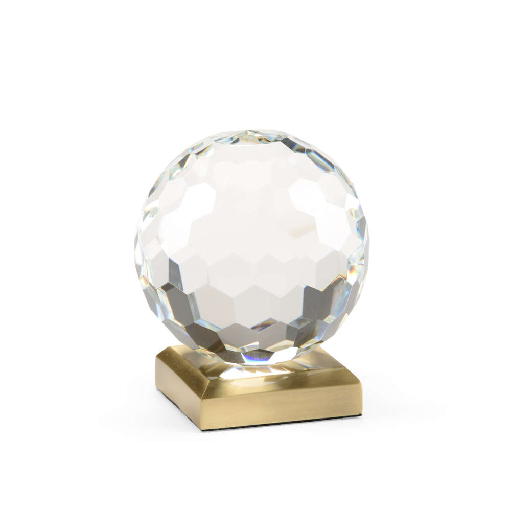Dress up your space with this exquisite cast crystal architectural obelisk. Standing 23" high atop an antique brass base, the lofty pillar is paired with a orb for a modern contemporary look. Display on a table or mantel for an elegant touch to any design. Lisa Khan creation