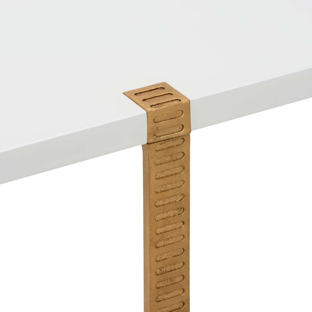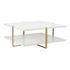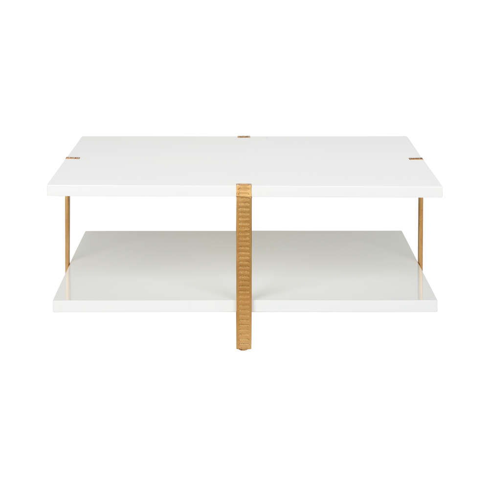 Sleek, sophisticated cocktail table featuring two levels held together by ribbed metal brackets in antique gold. Equally at home in contemporary or traditional environments. Designed by Elizabeth Wicker.