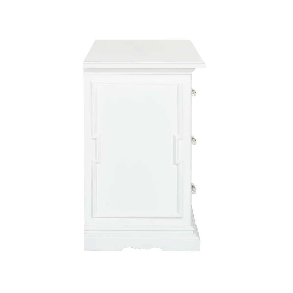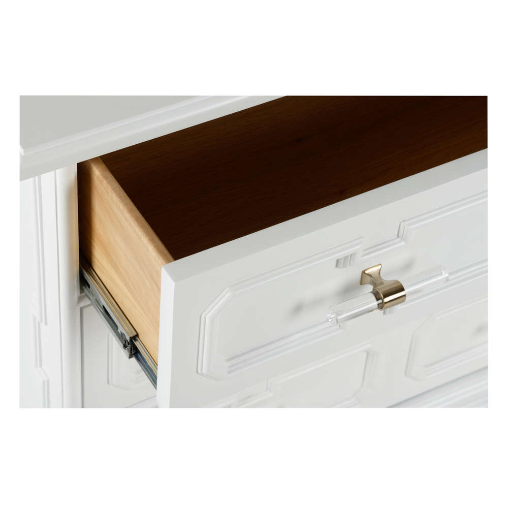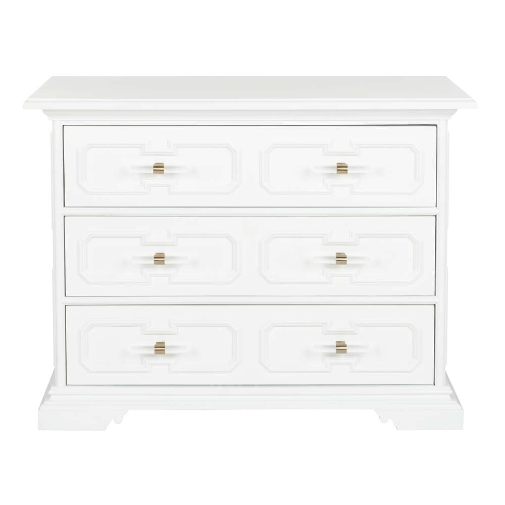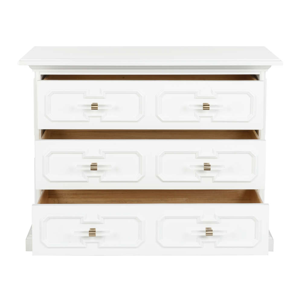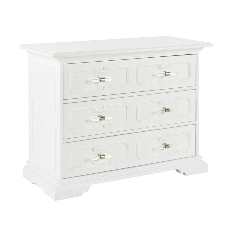 A fresh perspective that was inspired by a classic piece, the 3-drawer River Steet Chest is an inviting silhouette with a garden trellis design finished in white lacquer and modern acrylic handles. Perfect for any entryway or living room. Designed by Bill Cain.