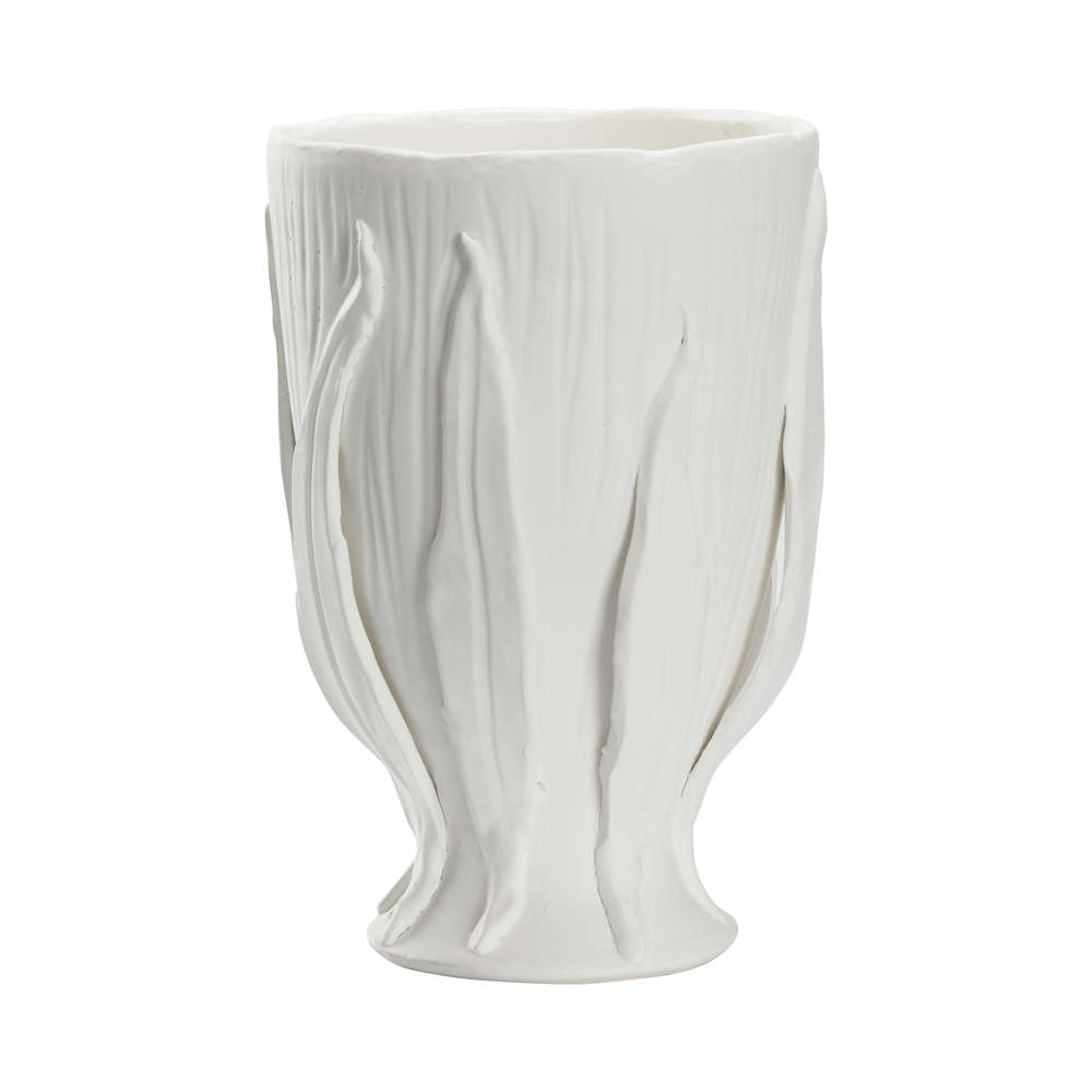 A touch of rustic d残or with a hand thrown Italian ceramic vase with a rich glaze. The softness of the climbing leaves brings texture and dimensions to the Umbria Footed Vase in green.