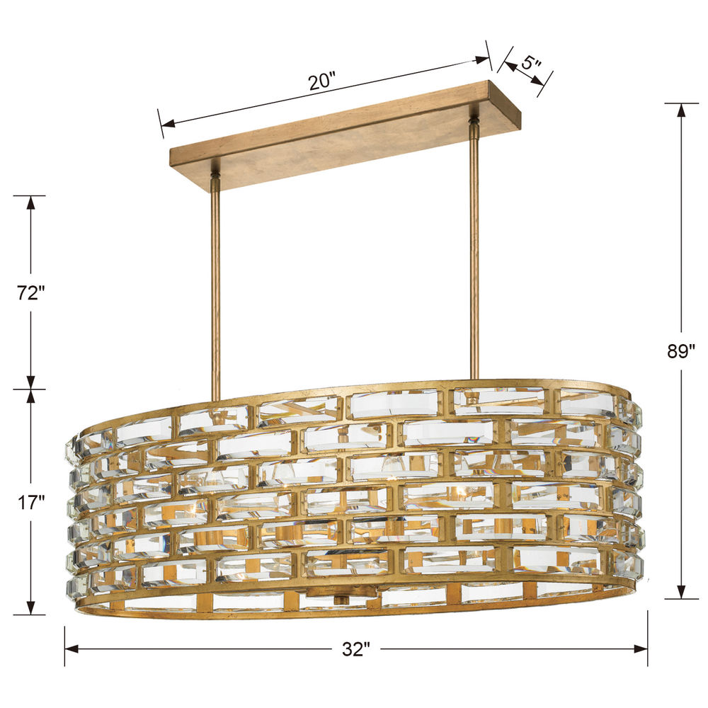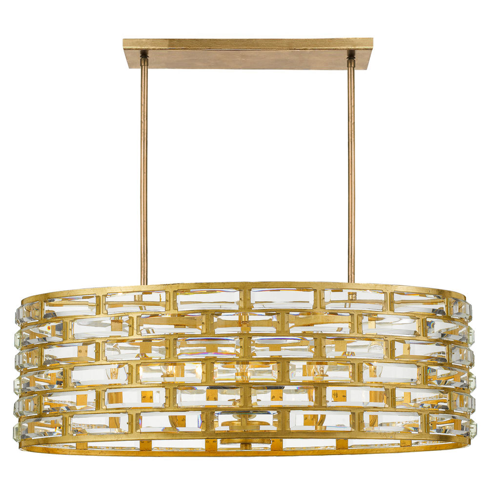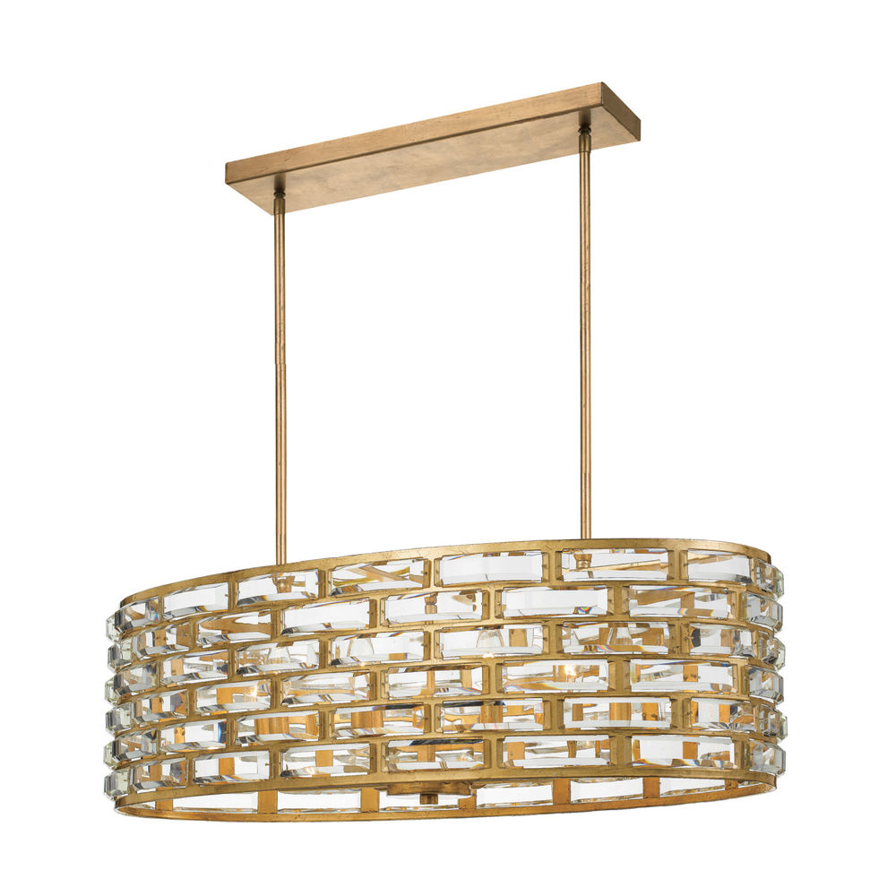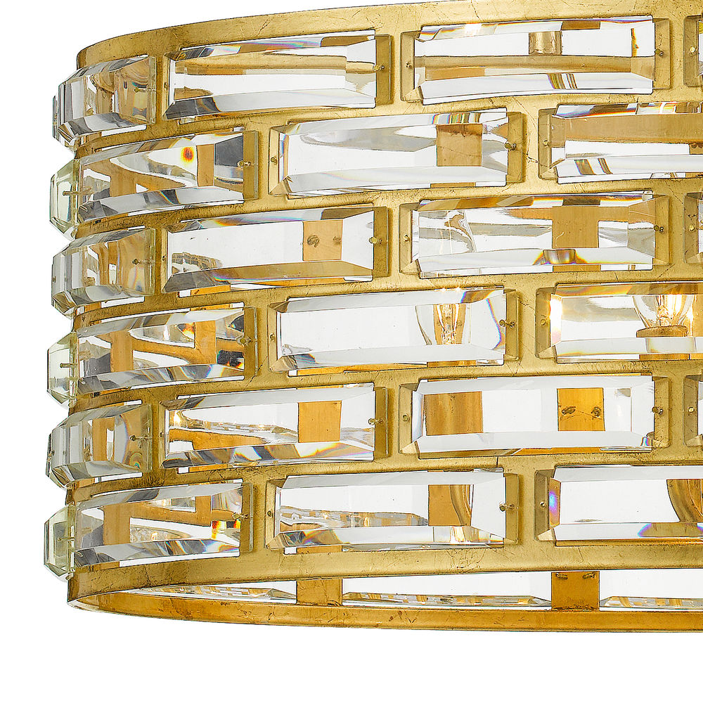 Rich faceted cut crystal meets clean golden lines resulting in vibrant style for any home. Candelabra lights shine through the open drum design of the Meridian. The rhythmic frame features rich curved faceted cut crystal jewels arranged on a contemporary frame. This statement piece is perfect to add grandeur to a dining room, hallway or bedroom.