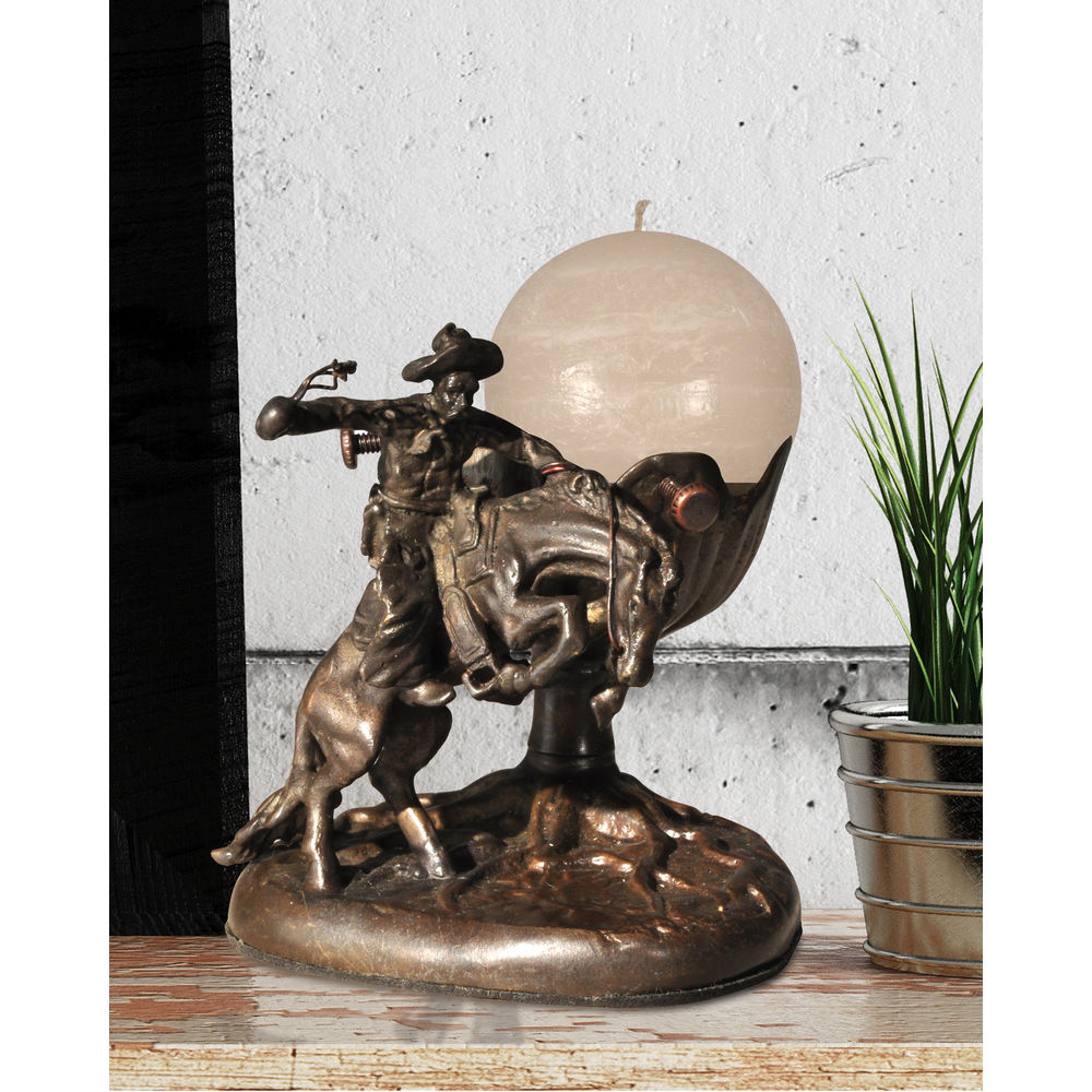Reminiscent of the Remington western sculptures of yesteryear, our bold Bucking Horse Candle Holder will be sure to please the inner cowboy in your family and friends. The figure features a brave bronc buster sitting atop his animated mount in a lovely bronze finish. Even the most discerning aficionado will appreciate the miniscule attention to detail in the horse and rider that gives this piece its museum worthy appearance. A large cut leaf candle cup sits just behind that will accommodate a sizable pillar candle that is designed to illuminate the horse and rider from behind, creating the illusion of the cowboy riding off into the sunset. A lovely gift for the western or equine enthusiast, our Bucking Horse Candle Holder is a great accent piece in offices or dens that will be enjoyed by young and old alike for years to come.