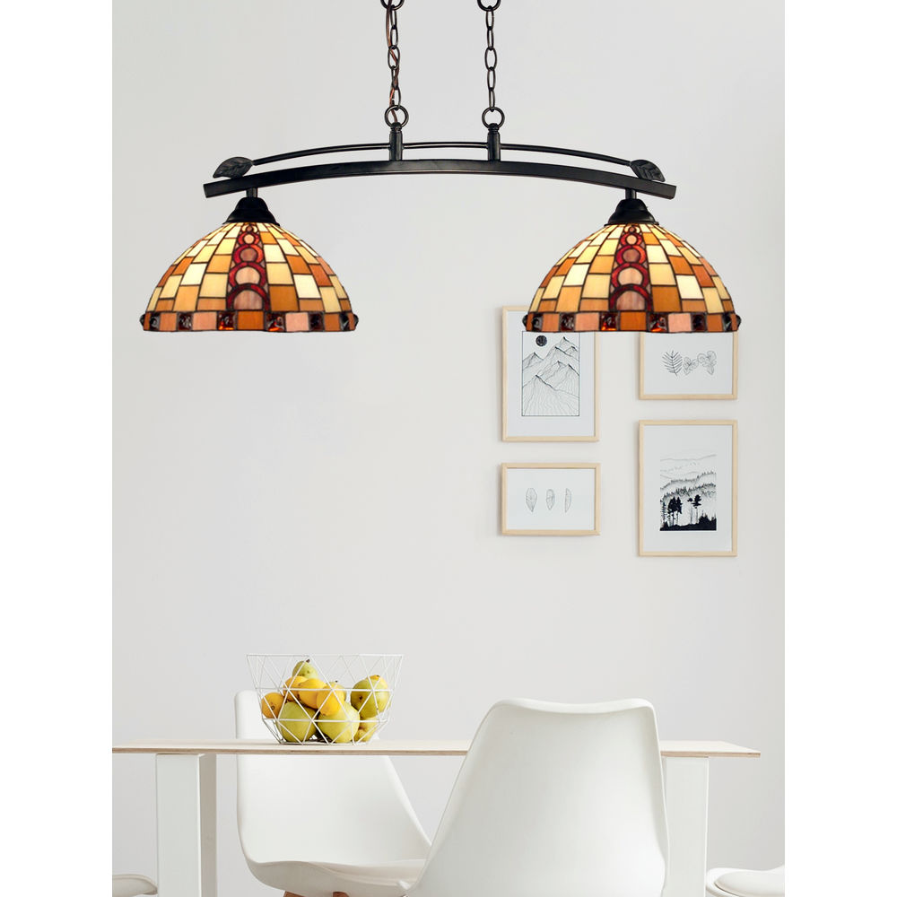 Our sunny Lakewood 2 Light Tiffany Island Fixture adds a sunny splash of color to any home. The fixture features a pair of matching dome shades. Each shade is handcrafted in art glass pieces in variegated amber tones that are set in an allover checkerboard pattern. We placed vertical columns of glass gems surrounded by art glass panels in matching colors around the shade for added sparkle. Each shade's bottom border features a row of glass gems in complementary colors. Please note that because the shades are handcrafted, differences in color and texture may vary slightly. The shades are hung from oval metal ceiling canopy, dual chains and an elegantly arched center support bar with branch and leaf detailing, all finished in rich Dark Bronze. A great way to illuminate a dining area, kitchen island or gaming table, our Lakewood Twin 2 Light Island Fixture is crafted to last to provide you with many years of stylishly reliable lighting.
