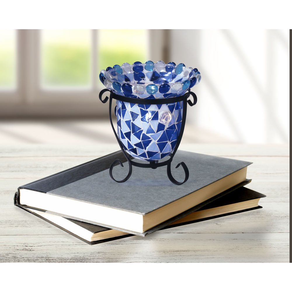 Vivid shades of blue and white make our Blue Chip 4-Piece Mosaic Candle Holder Set a bright addition to any decor. The set features 4 cup style candle holders. Each is crafted of art glass in variegated shades of blue and white. We added clear glass gems in the body and a row of blue and white glass gems around the top for added sparkle and color when you add a lighted votive or tea light candle (candle not included). The set includes black metal holders with scrolled feet for display. A lovely gift for any occasion or even for yourself, our Blue Chip 4-Piece Mosaic Candle Holder Set is destined to become a family favorite.