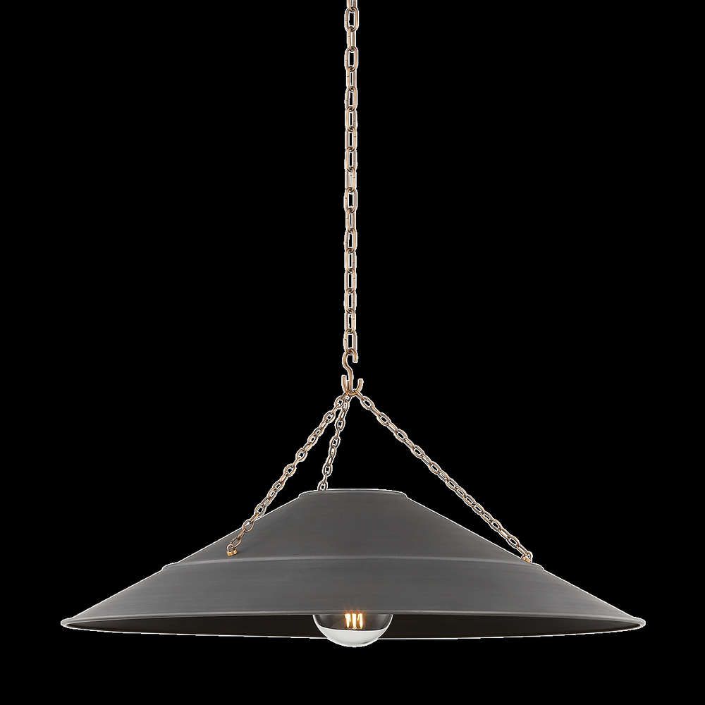 With its exposed metalwork, chain detailing, and unique finish combination, Arcane has an elevated, industrial vibe. The graphite shade feels chic and gives off a warm glow. The Patina Brass hardware, chain, and canopy add a hint of shine that plays wonderfully off the graphite. The twisted black fabric cord is a subtle detail that gives the pendant a vintage feel. Part of our Lauren Liess collection.