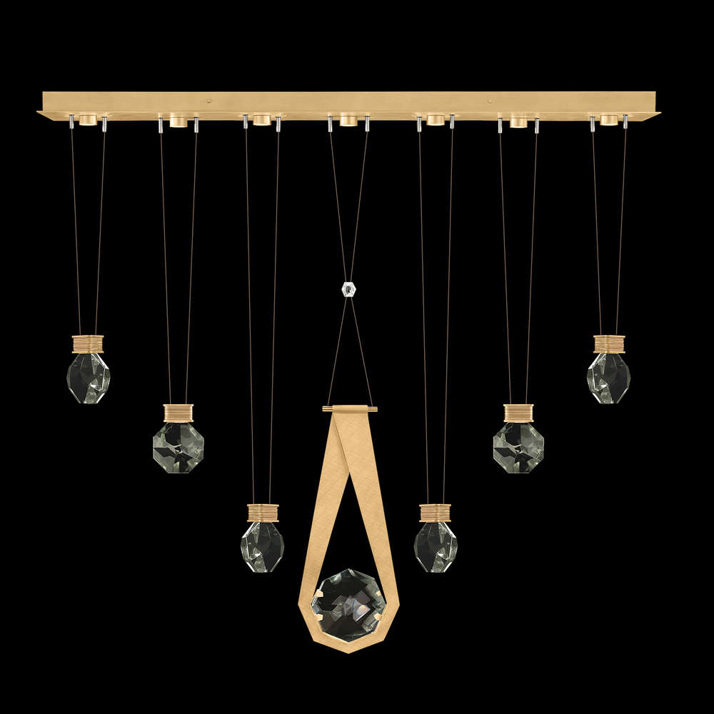 Seven-drop linear pendant inspired by the sophistication and versatility of necklace charms. This collection empowers you to curate your unique piece with its five exquisite finishes and four distinct charm designs meticulously crafted using opulent faceted optic crystal. Each charm shines like a gem, captivating attention. Whether you desire the delicate dance of light reflecting off the crystal or the functional illumination from above, Aria's integrated LED lights bring your vision to life.