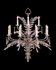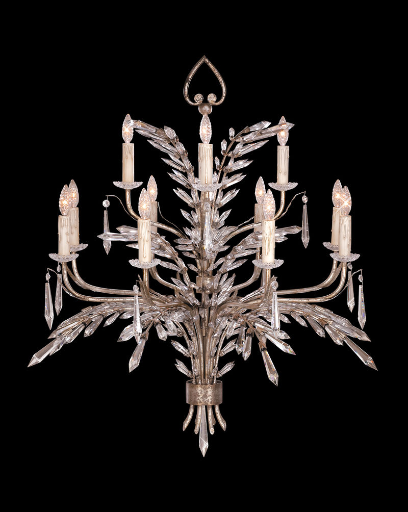Chandelier of steel in warm antiqued silver finish. Features brilliant icicle lead crystals. Shown with faceted bulbs.
