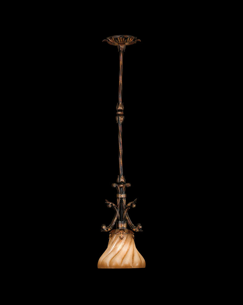 The Fine Art Lamps 322740ST drop light is from the Brighton Pavillion collection and measures 38H x 10W inches. It uses (1) 100 watt medium base bulbs. The socket type is porcelain. This drop light weighs 6 pounds. For international 220 Volt application, the 322740ST drop light measures 96.52H x 25.4W cm. It uses (1) 100 watt medium base bulbs. The socket type is porcelain. This drop light weighs 2.73 kilograms. Drop light in bronzed sienna finish. Features hand-blown gold-dusted glass shade. May hang at an angle.