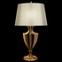 Dimensional vase inspired table lamp in dore gold finish features distinctive urn figure design. Hand-tailored shade of elegant silk.