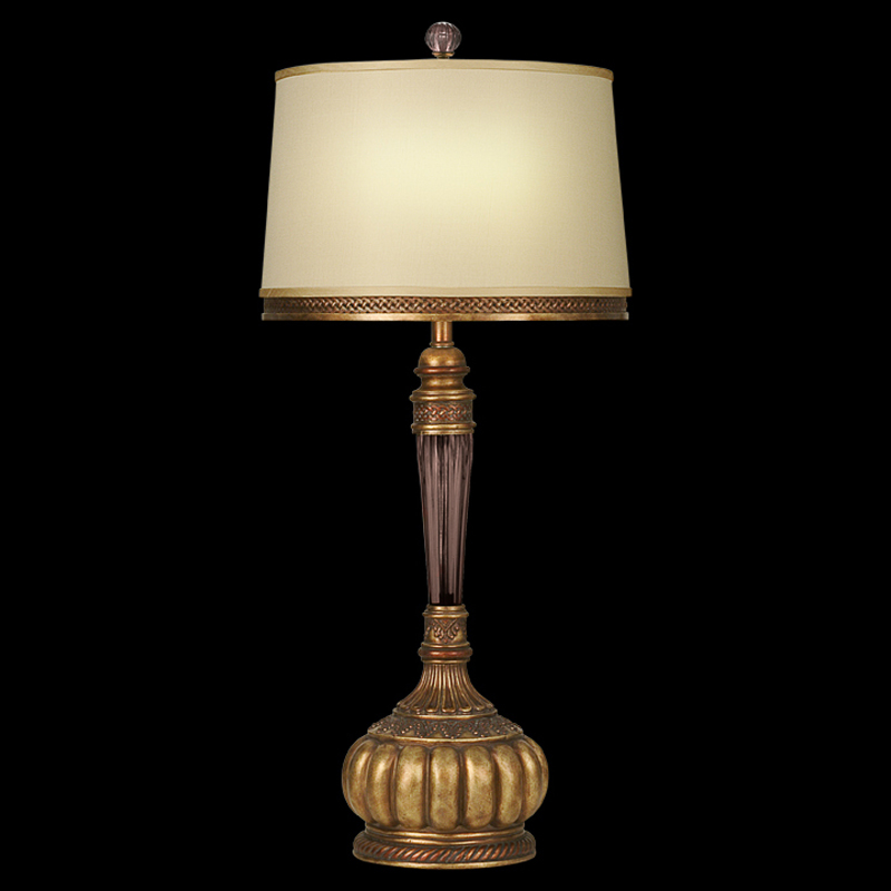 Table lamp in antique gilt bronze finish with pale amethyst torso. Solid brass fittings with copper accents. Hand sewn shade of shimmering gilt lam? with brass filigree handing and pale amethyst glass finial.