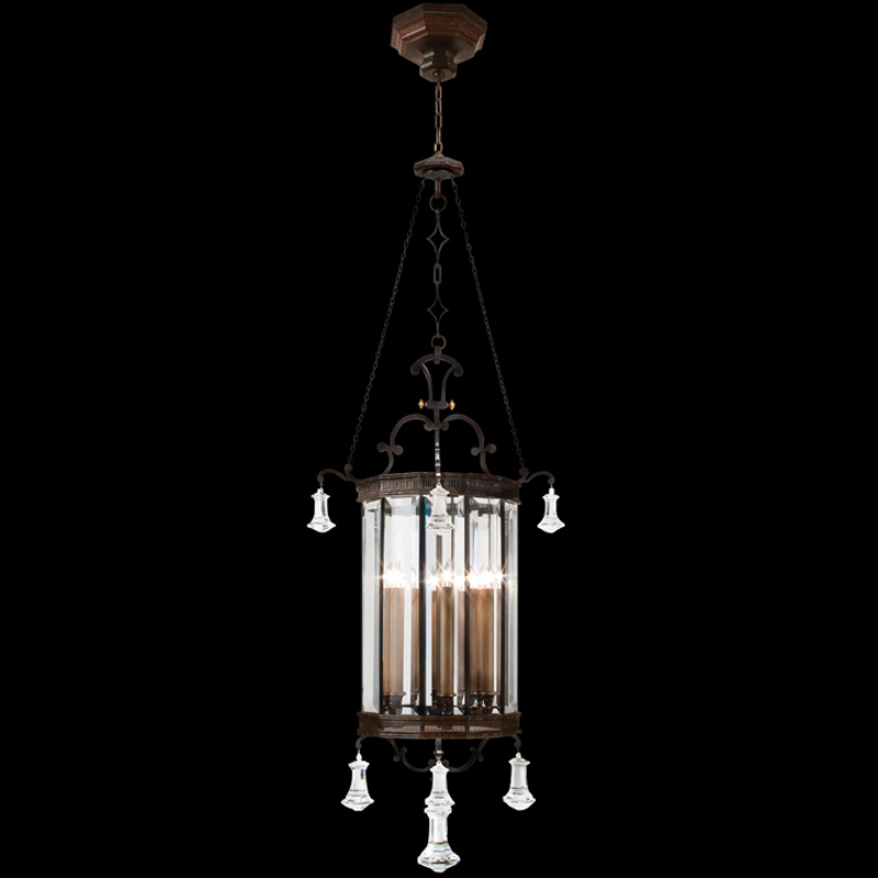 Lantern in rustic iron finish with garnet undertones.. Panels of beveled optic glass and brilliant pendants. Includes 18 decorative chain for height adjustment. Also available in warm muted silver leaf finish: 585440-2