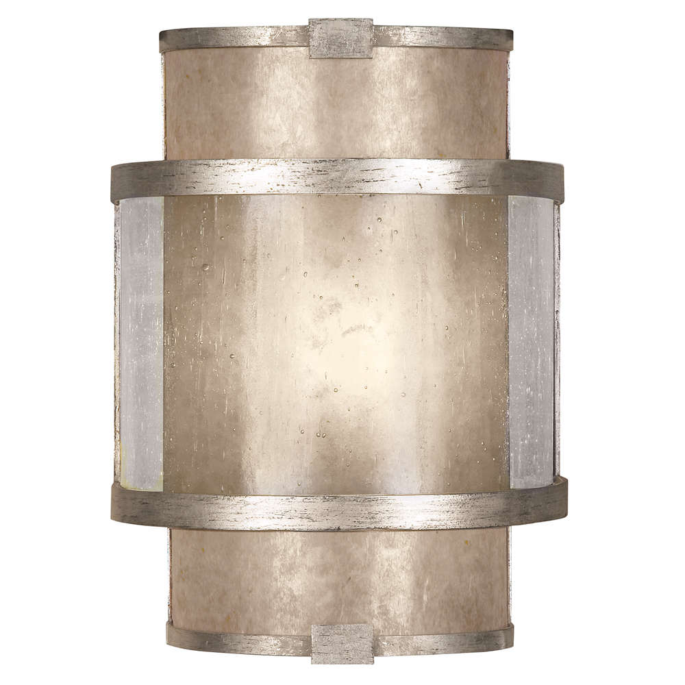 Sconce in a warm muted silver leaf finish and warm translucent mica shade with metal frames. Features unique hand blown glass pendant. ADA Compliant Also available in brown patinated bronze finish.