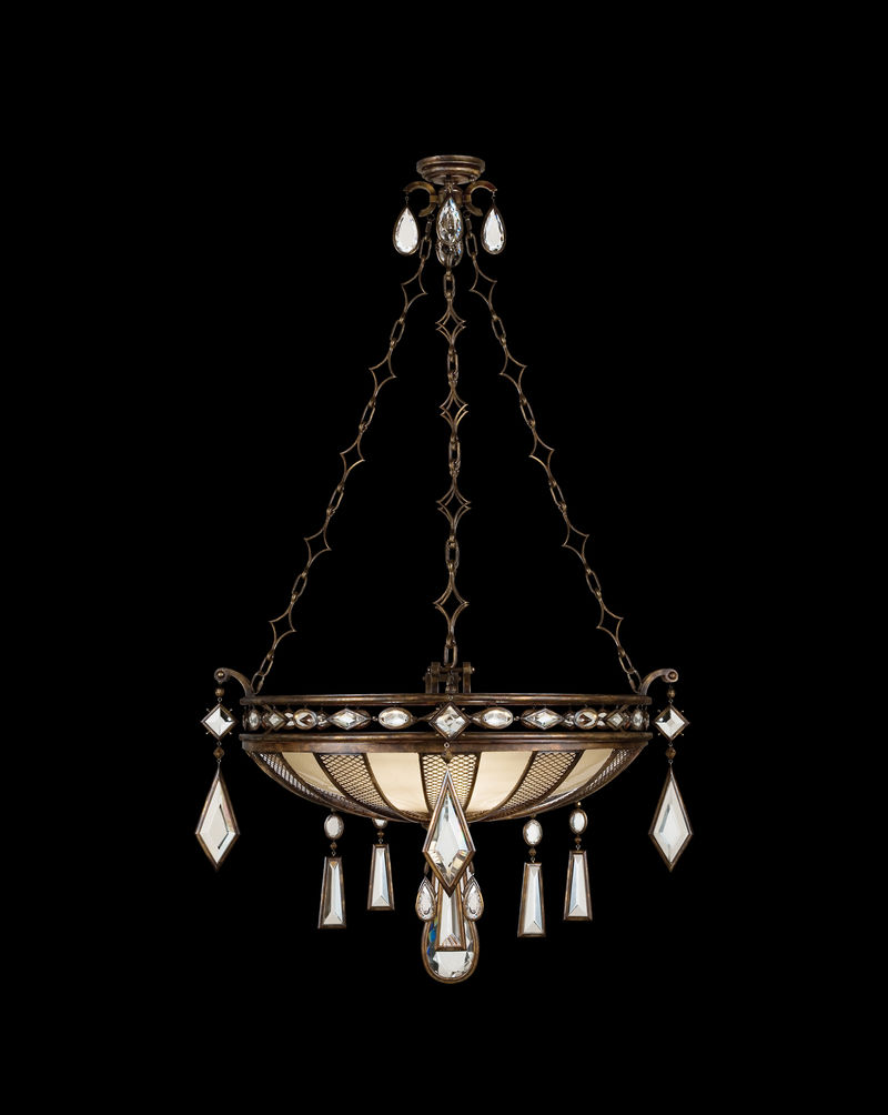 The Fine Art Lamps 712240-3ST pendant is from the Encased Gems collection and measures 23H x 35W inches. It uses (3) 150 watt medium base bulbs. The socket type is porcelain. This pendant weighs 65 pounds. For international 220 Volt application, the 712240-3ST pendant measures 58.42H x 88.9W cm. It uses (3) 150 watt medium base bulbs. The socket type is porcelain. This pendant weighs 29.55 kilograms. Pendant in venerable bronze patina with clear crystal gems. Includes 6 decorative chain for height adjustment.