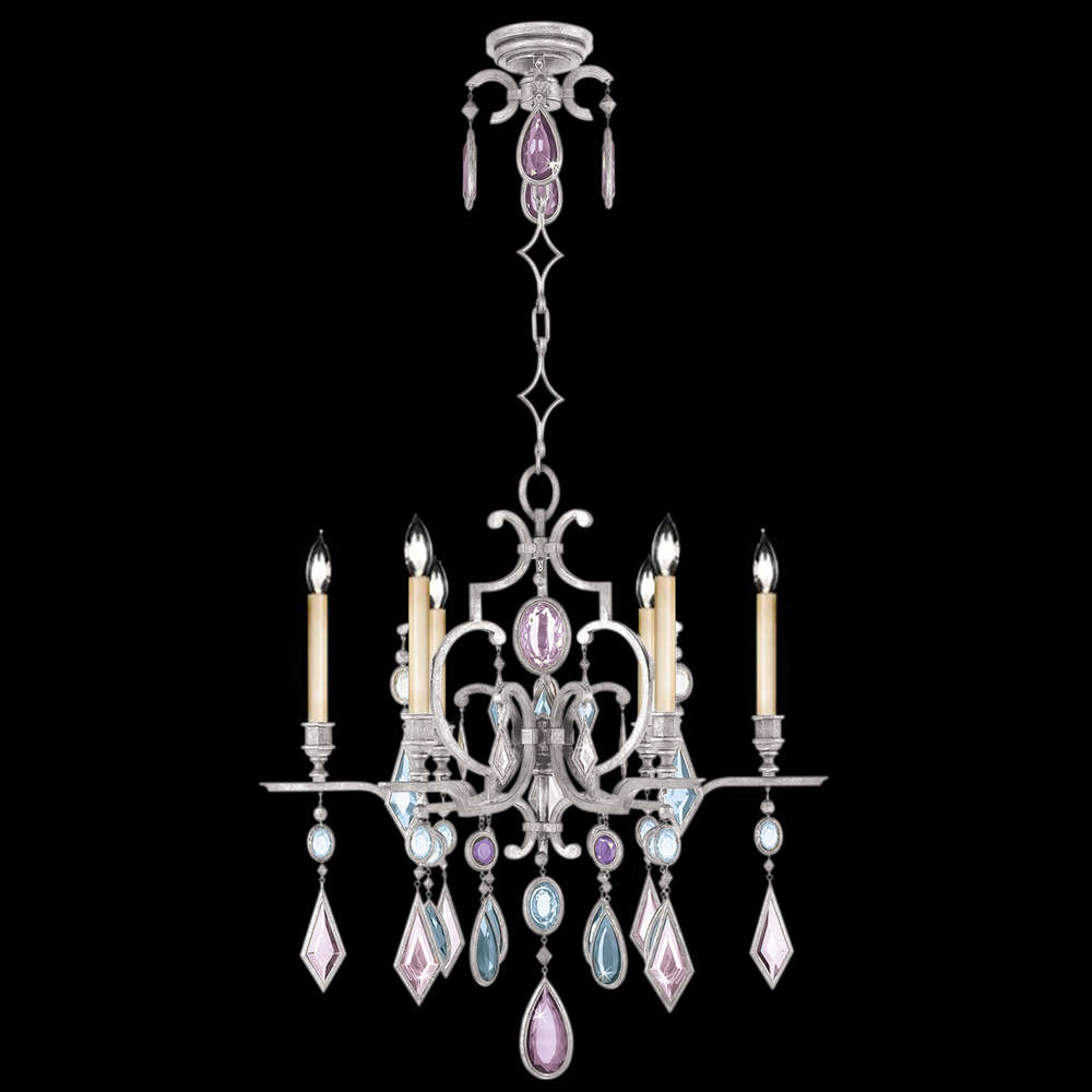 Chandelier in vintage silver leaf finish with multi-colored crystal gems of amethyst, tourmaline, and aquamarine colors. 6' decorative chain included.