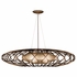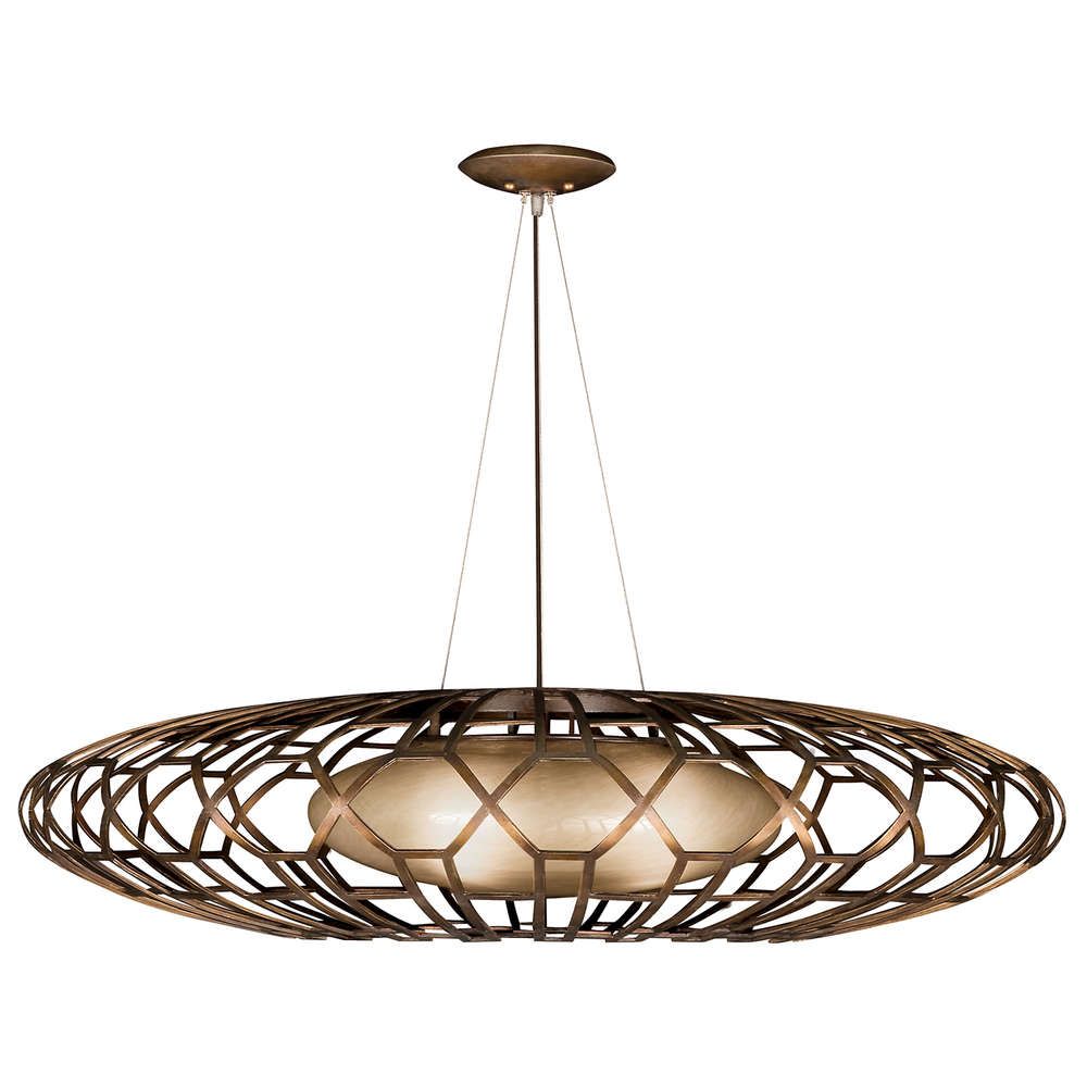 Pendant in a rich bourbon finish with golden mist highlights and an intricate open-work metal cage revealing an interior shade of hand-blown glass. Supported by 3 adjustable steel cables.