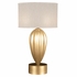 Table lamp in a gold leaf finish with champagne fabric shade.