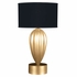 Table lamp in a gold leaf finish featuring a black fabric outer shell shade with a gold metallic inner lining.
